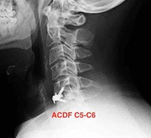 En el tratamiento quirúrgico de una hernia discal cervical la gran mayoría de especialistas optarán por una artrodesis cervical del segmento afectado, conocida por sus siglas ACDF (anterior cervical discectomy and fusión) que con una incisión por la parte anterolateral del cuello se accede hasta el disco afectado y se reemplaza por un espaciador que va a fusionar la vertebra superior e inferior.